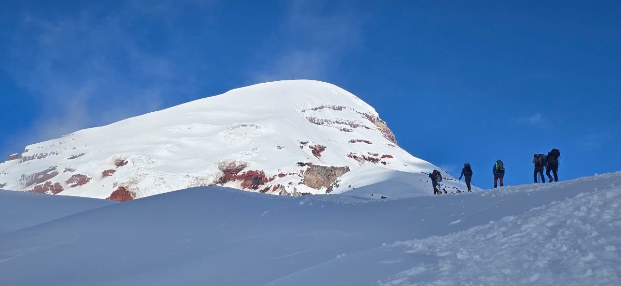 Cotopaxi’s normal route involves moderate glacier travel. Chimborazo is longer and physically more demanding with glacier travel skills required.